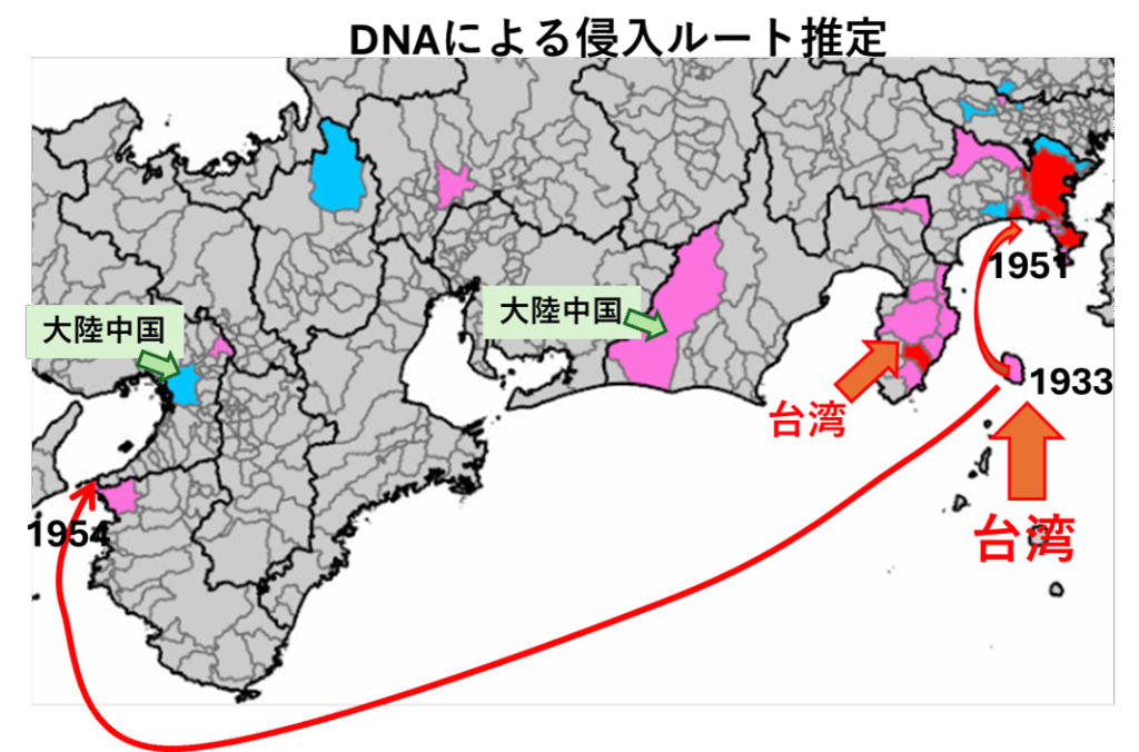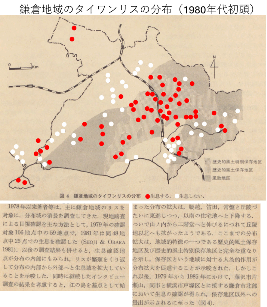 伊豆大島から江の島動物園に連れて来られたリスがいたのですが、昭和26年(1951年)そのうちの50匹が逃走しました。その子孫たちが鎌倉や三浦半島、湘南地方から横浜市南部に広がったものといわれています。1970年から1980年代に行われた生息調査により、丘陵づたいに東進しつつ鎌倉の歴史風土保存地域内に生息地域を広げていったことが推定されています。そして1980年代初頭には片瀬山や鎌倉北部での確認もなされ、侵出が本格化していることが報告されています。そして今では鎌倉で年間2000匹以上が捕殺され、横浜市やひろく三浦半島でも問題になるくらいに増えています。(前回記事参照)