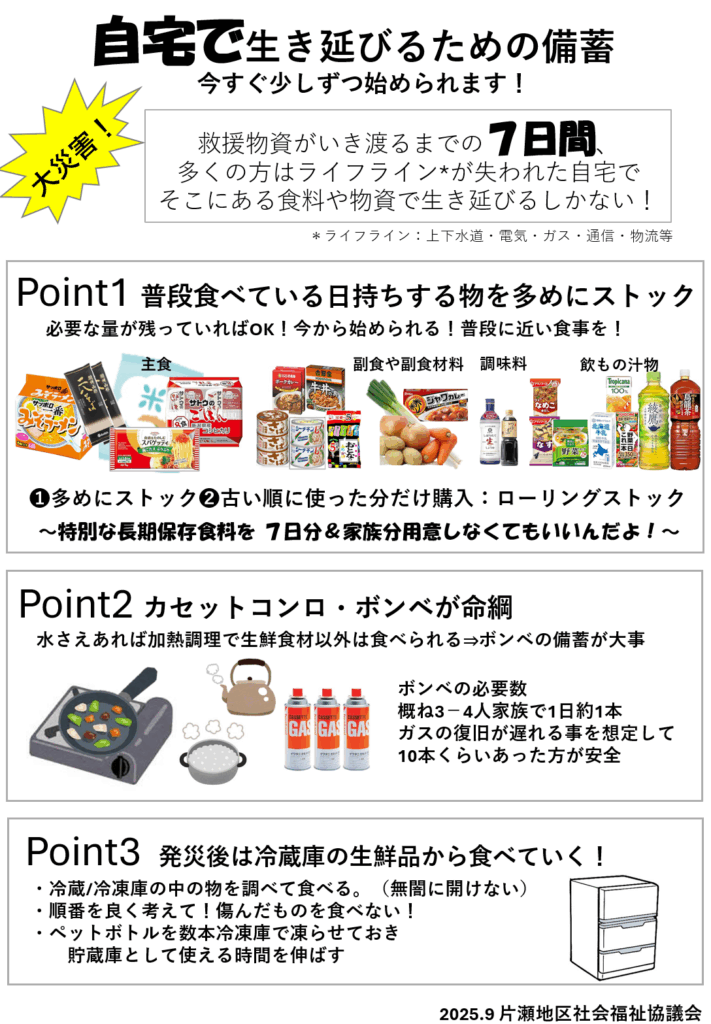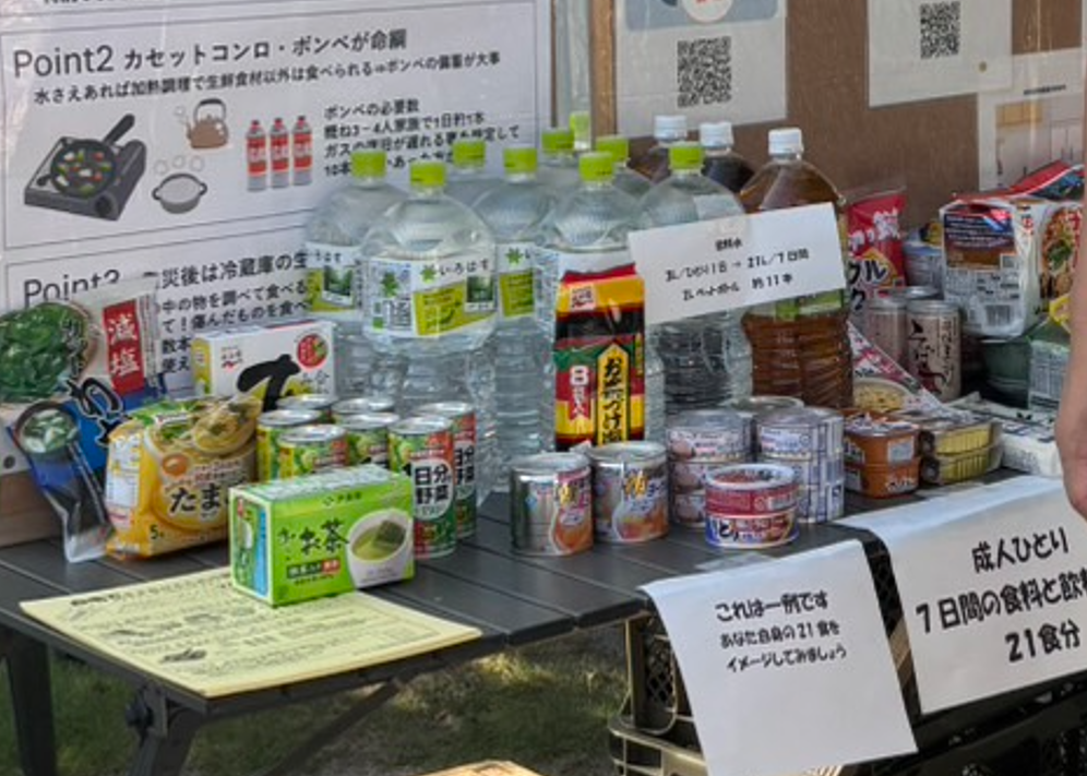 備蓄として必要な食料の実物を見える形で展示しました。それを見て頂いた上で、それぞれのお宅で、人数に合わせてどの程度の備蓄が必要か?の目安を算出することができるチラシを配りました。