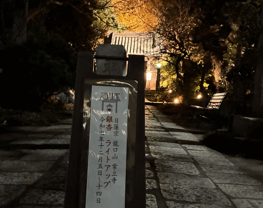入口の車止の前にある下記看板の通り、藤沢市片瀬の常立寺では12月5日~14日の間ライトアップが行われています。(看板の裏には、ご自由にご参拝下さい とあります。