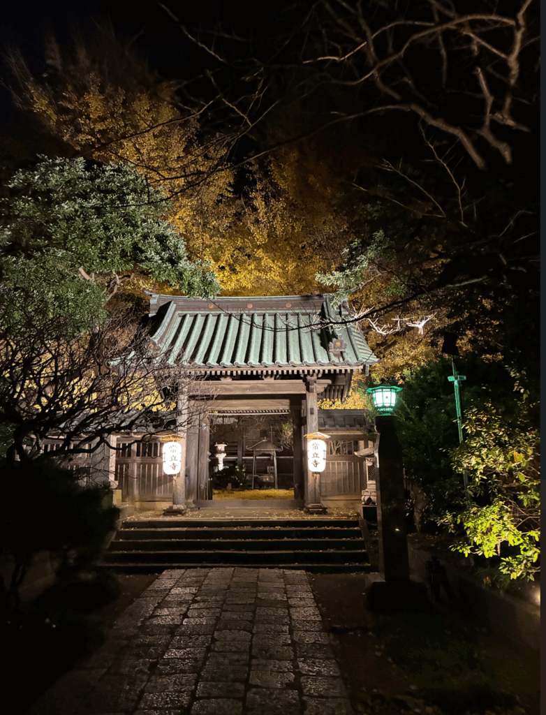 歩を進めると点灯された提灯があり、山門内にはまばゆい黄金色が輝いて、周囲の暗さと合わせて荘厳な雰囲気に包まれています。