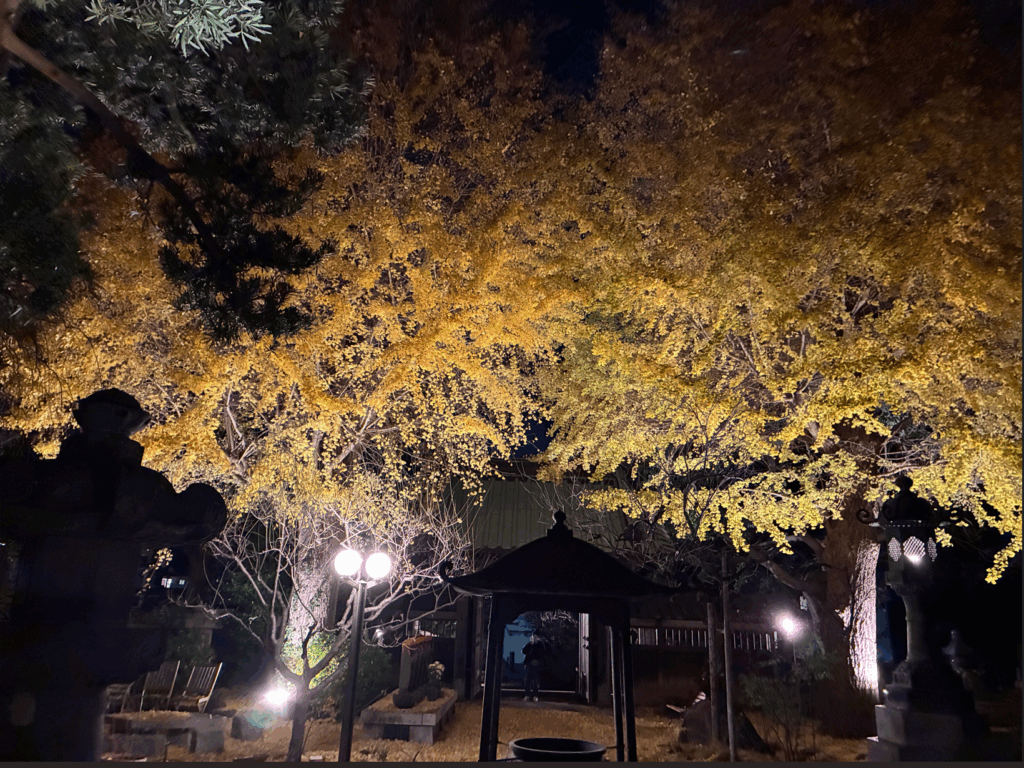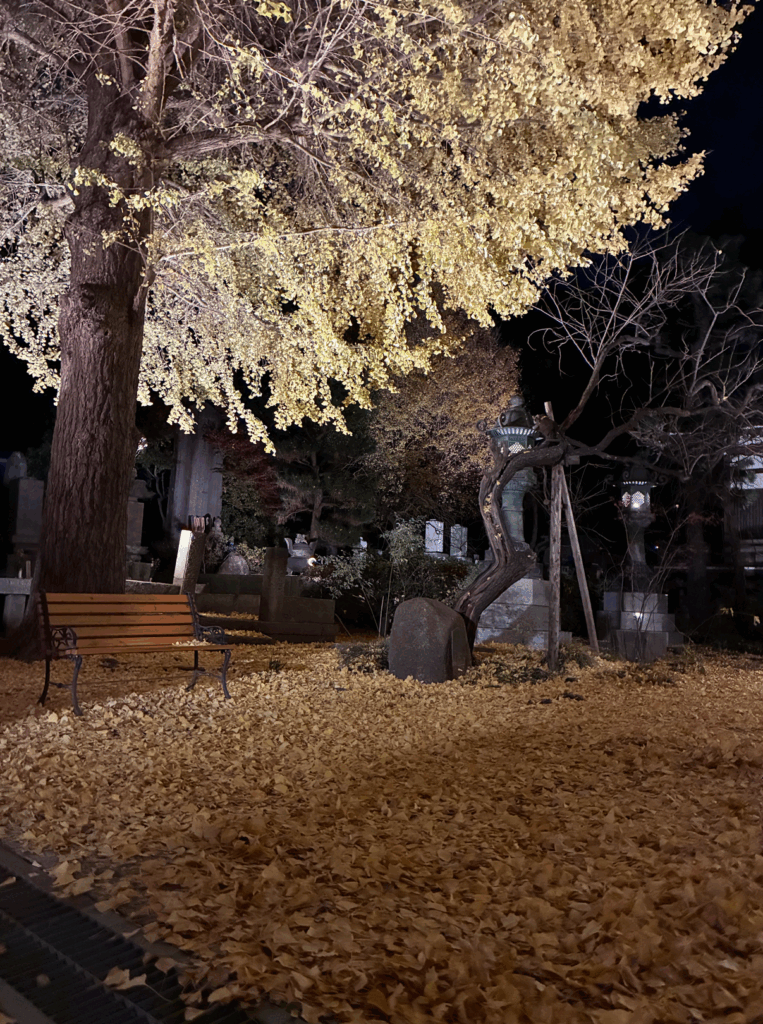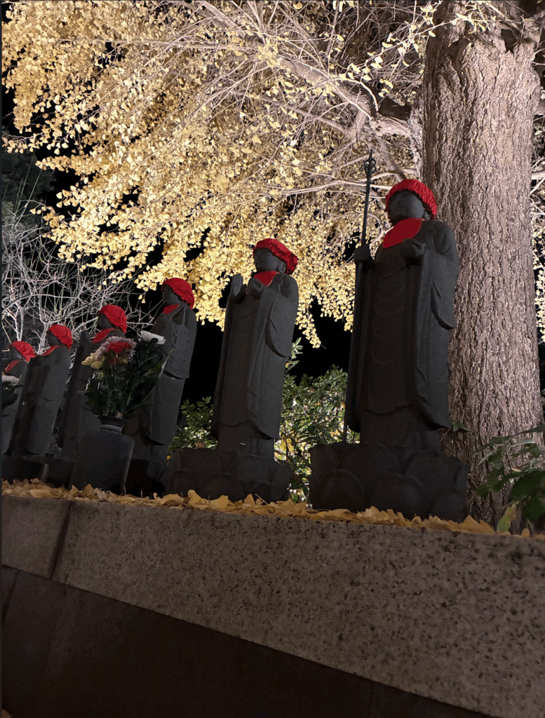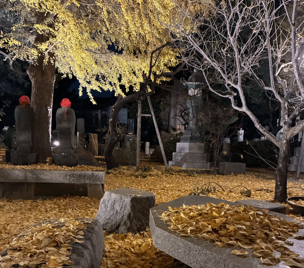 ライトアップされたイチョウの葉、地面に落ちた葉にお地蔵さんの赤い頭巾の色が映えて美しいです。立派な灯篭も荘厳さを加えています。