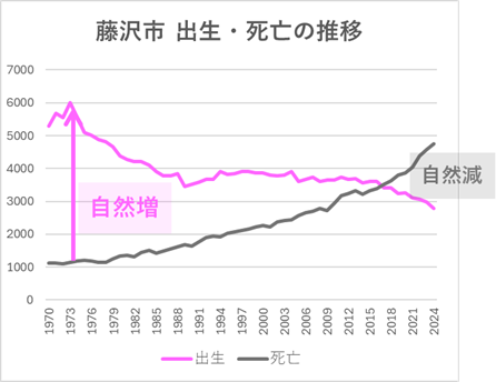 1970年代は出生数が死亡数を大幅に上回り、とても若い街だったことがわかります。しかしここ10年くらいに出生数と死亡数が逆転し自然減が急増しています。(次のグラフ)