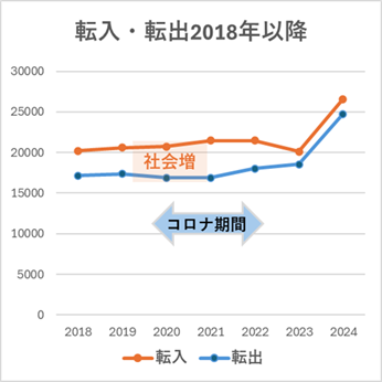 この傾向は2022年まで続いたのですが、2023年に一気に状況がかわりました。転入・転出の差が減り、2024年には転入者も転出者も急増してその差が少ない という大きな傾向変化がありました。これが今後どうなるかは大いに注目する必要があると思います。