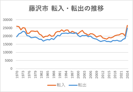 ただ、藤沢市の場合は2024年には転入・転出とも過去最高レベルを記録しているので、そんな単純な話ではないだろうと思われますが、他に比べれば多いもののコロナ期に着実に増加した社会増はこの2年で急ブレーキがかかり低迷したと言えます。