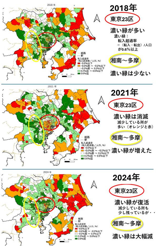 コロナのころ(2021年ころ)は都心部から周辺(例えば湘南地方や多摩地方)への転出が増えたものの、コロナ禍終息とともに、元に戻ったことが読み取れます。