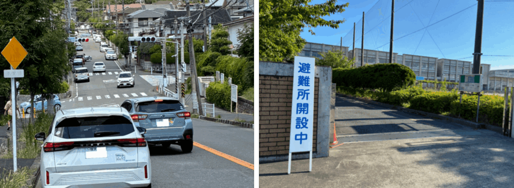 左 7月30日の午前11時すぎ撮影 片中前の道路 右 同日の片中正門