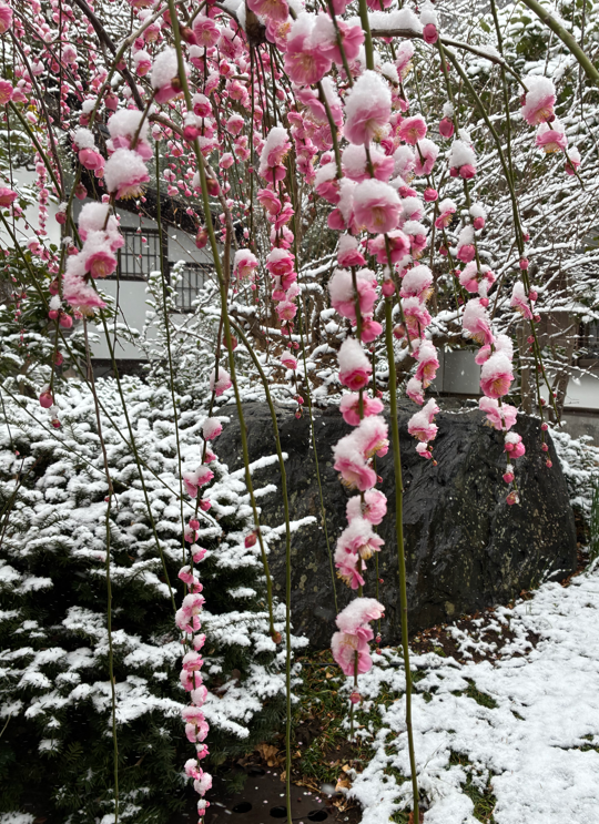 しだれ梅がたくさん咲いていますが、どれも雪をかぶっています。