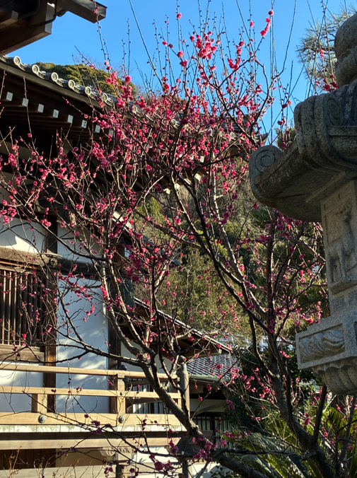 本堂前の紅梅は青空に鮮やかさがひときわでした。