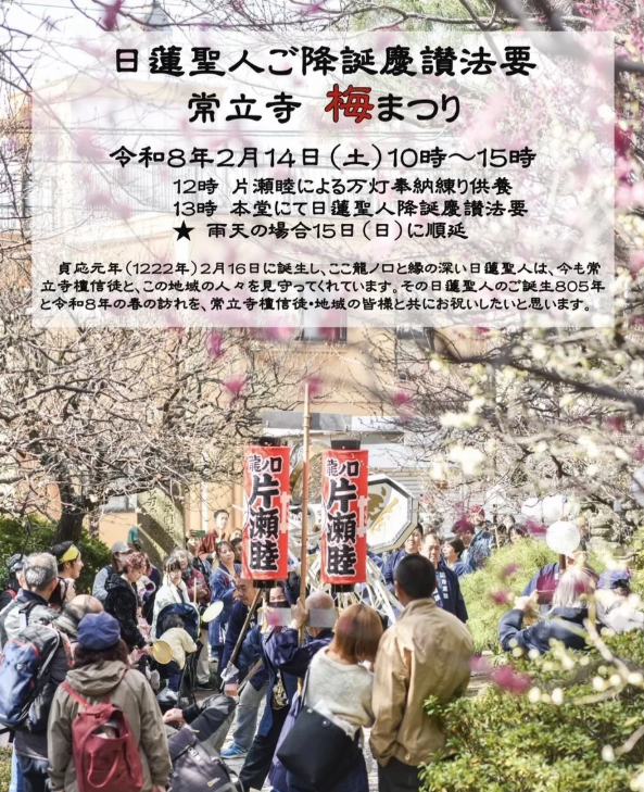 常立寺では2月14日(土)に梅まつりが開かれます。そしてこの日は2月16日の日蓮聖人誕生日を祝う法要も行われます。