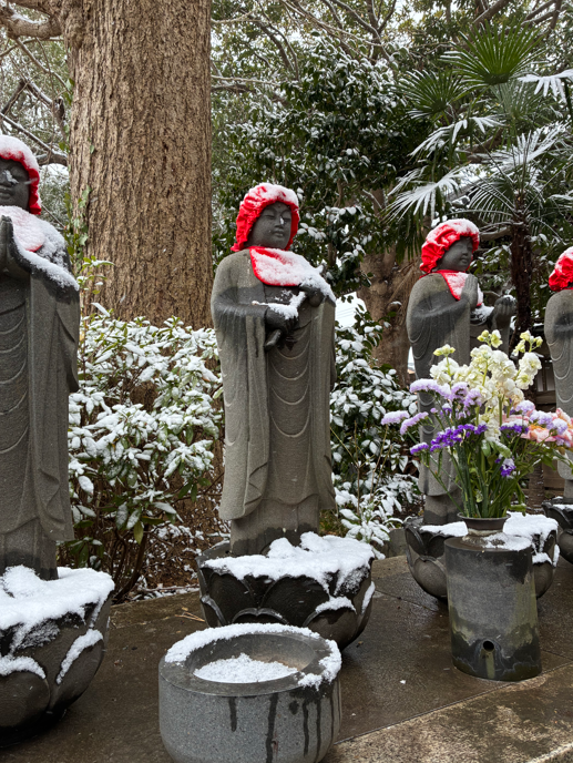 山門はいってすぐ右手の六体のお地蔵さんの赤い頭巾に雪が積もって寒そうですがきれいです。お供えの花々も寒そうに雪が積もっていました。