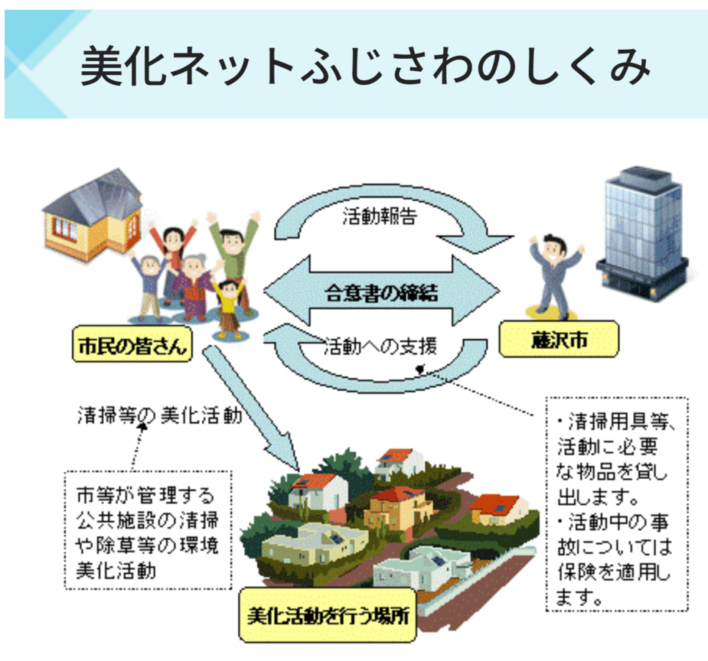 美化ネットふじさわ というのは市が管理する公共施設の清掃や除草等に協力してくれるボランティア団体に、市が清掃用具や必要な物品の貸出をしたり、活動中の事故に保険をかけてくれる という制度です。