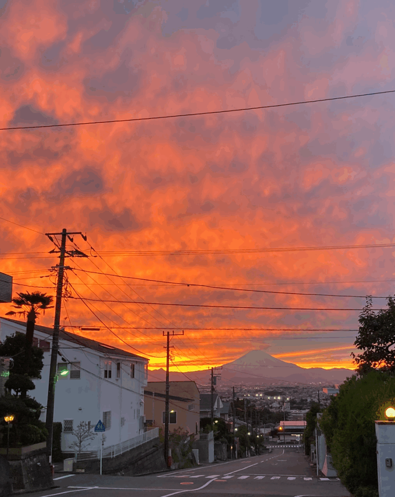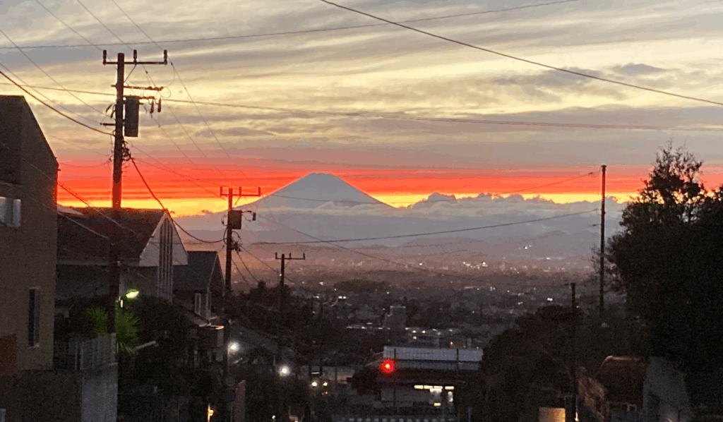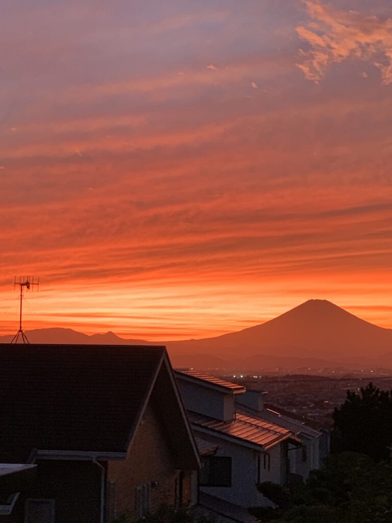 片瀬山では年に何回か美しい夕焼けがみられるのですが、雲のグラデーションの具合といい富士山のくっきり具合といい、ここ数年でもっとも美しいと思いました。
